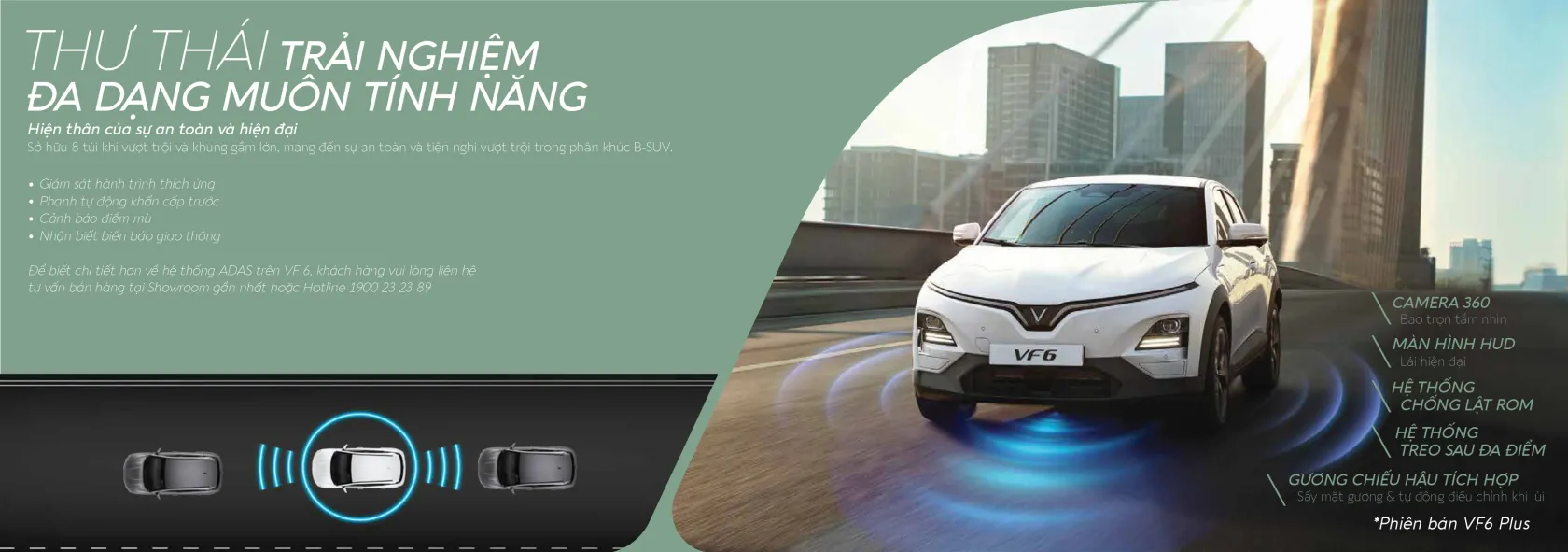 Tính năng an toàn trên VinFast VF6 đều đáp ứng đủ tiêu chuẩn 5 sao của Euro NCAP, NHTSA và ASEAN NCAP. Xe được trang gói công nghệ hỗ trợ lái nâng cao, hỗ trợ di chuyển khi tắc đường, hỗ trợ lái đường cao tốc, tự động chuyển làn, hỗ trợ đỗ xe an toàn phần, triệu tập xe thông minh.