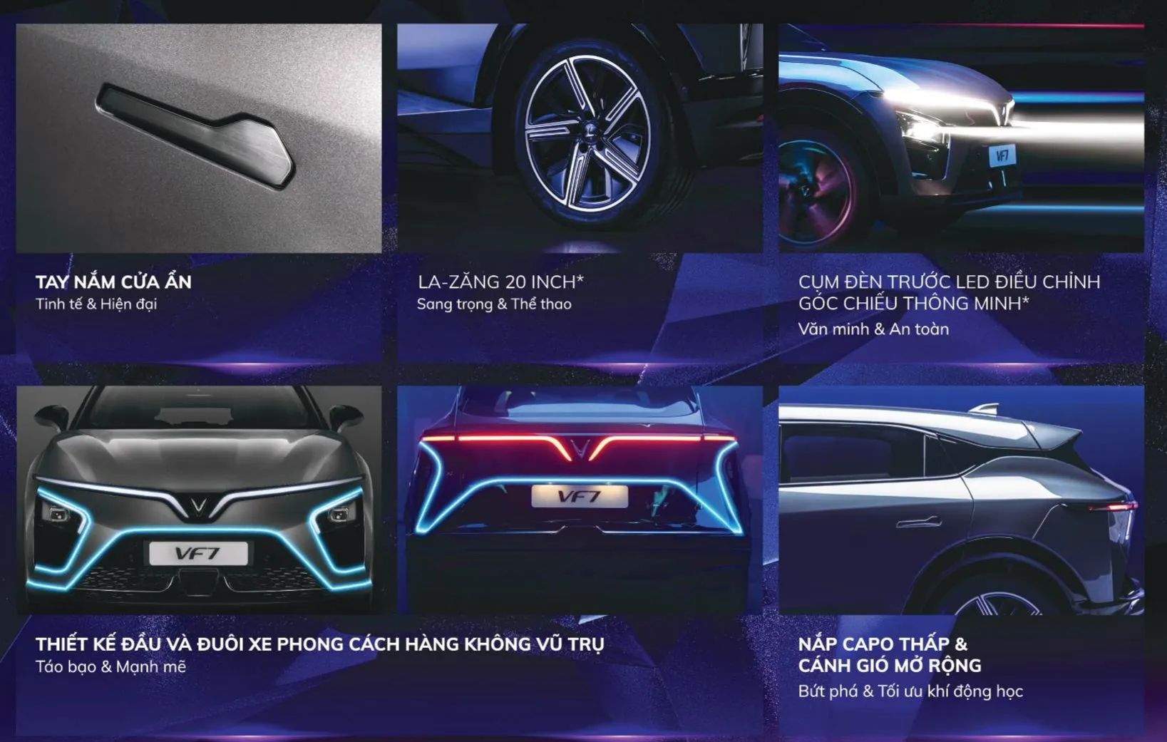 VinFast VF 7 được đánh giá là mẫu xe mang tính thẩm mỹ cao, cá tính, hiện đại, tối ưu tính năng khí động học và hướng tới tương lai. Sản phẩm được tạo nên bởi xưởng thiết kế danh tiếng Torino Design (Italy) với ngôn ngữ “Vũ trụ phi đối xứng”.