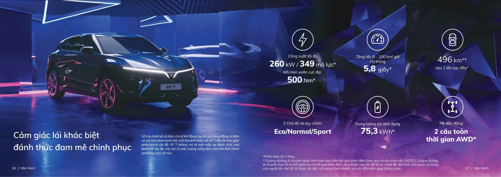 Về vận hành, VinFast trang bị cho VF 7 phiên bản Plus hai động cơ điện có tổng công suất tối đa lên tới 260 kW (tương đương 349 mã lực), mô-men xoắn cực đại 500 Nm, cùng hệ dẫn động hai cầu toàn thời gian, biến mẫu xe này thành cỗ máy mạnh nhất phân khúc. Kết hợp với bộ pin dung lượng 75,3 kWh, xe có thể di chuyển quãng đường tối đa lên tới 431 km/lần sạc đầy (theo tiêu chuẩn WLTP).